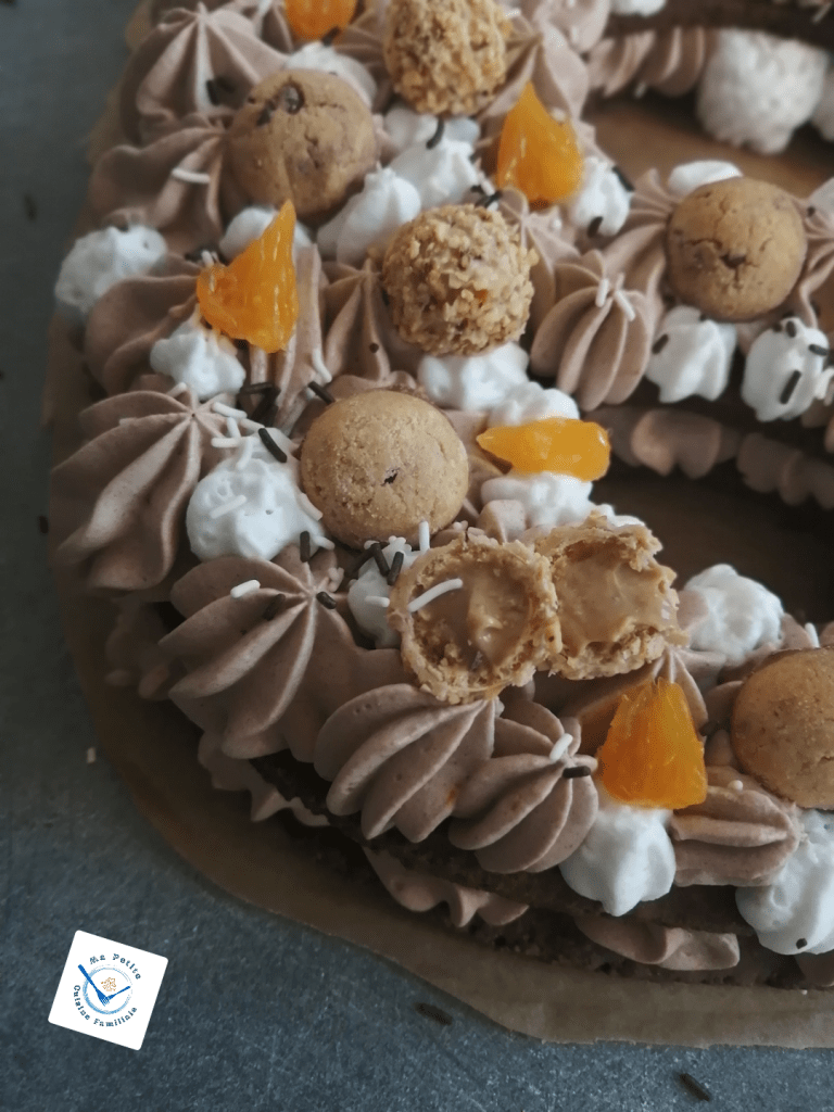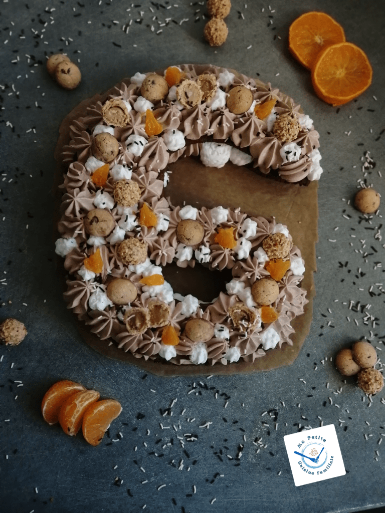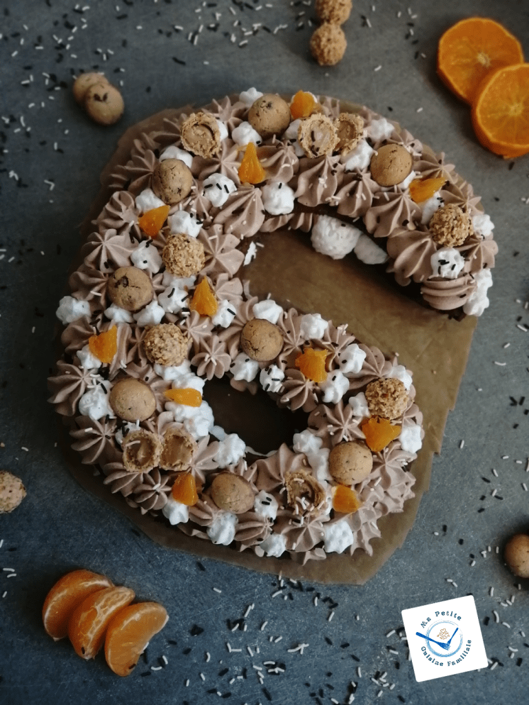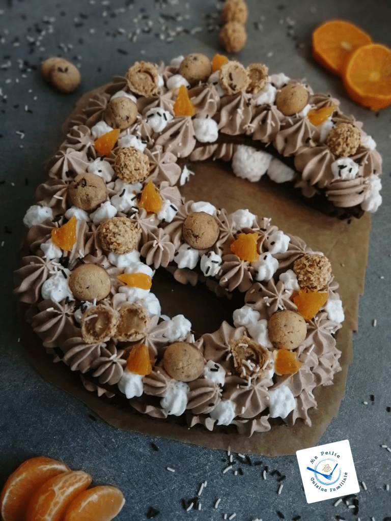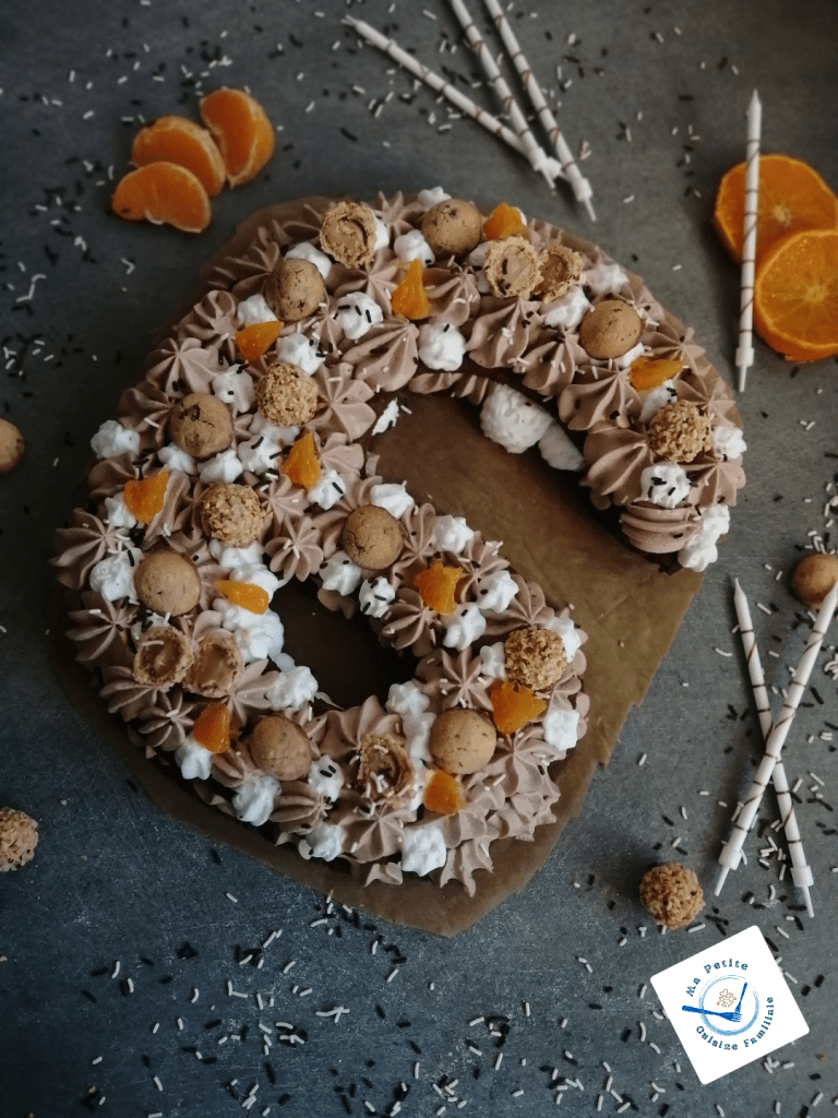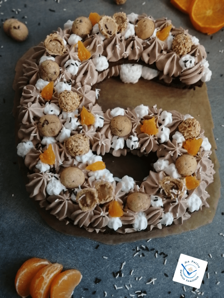 Un number cake composé d’une pâte sablée chocolat. Du croquant, fondant. D’une crème chantilly choco/clémentine et d’une chantilly vanille. Le tout rehaussé de bons morceaux de clémentines fraîches et de gourmandises à grignoter.