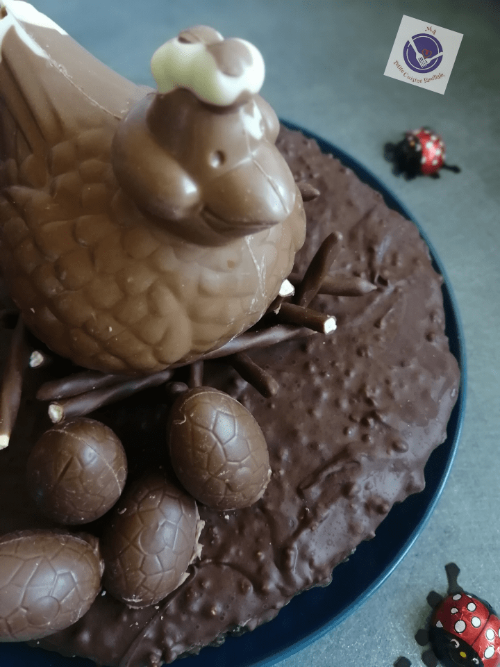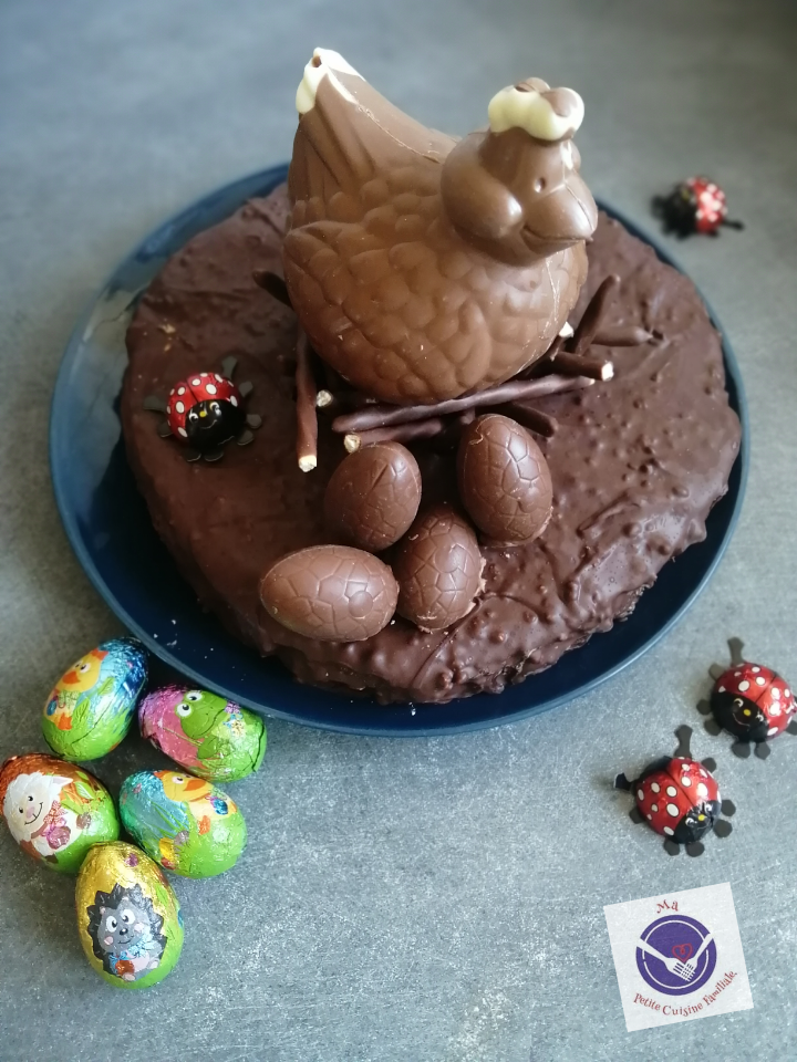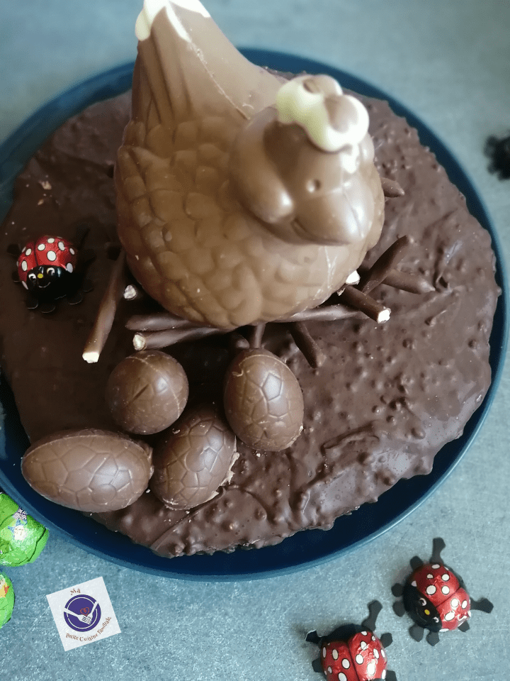 Un gâteau simple, surmonté d’un nid qui accueille poule et œufs en chocolat. C’est un gâteau au yaourt (quoi de plus simple…) et aux pépites de chocolat, enrobé d’un glaçage croquant au pralin. Le nid, vous le voyez sur la photo, ce sont des Mikados (ces célèbres biscuits en forme de baguettes, enrobés de chocolat. Sur ce nid, j’ai déposé une poule gourmande au chocolat.
