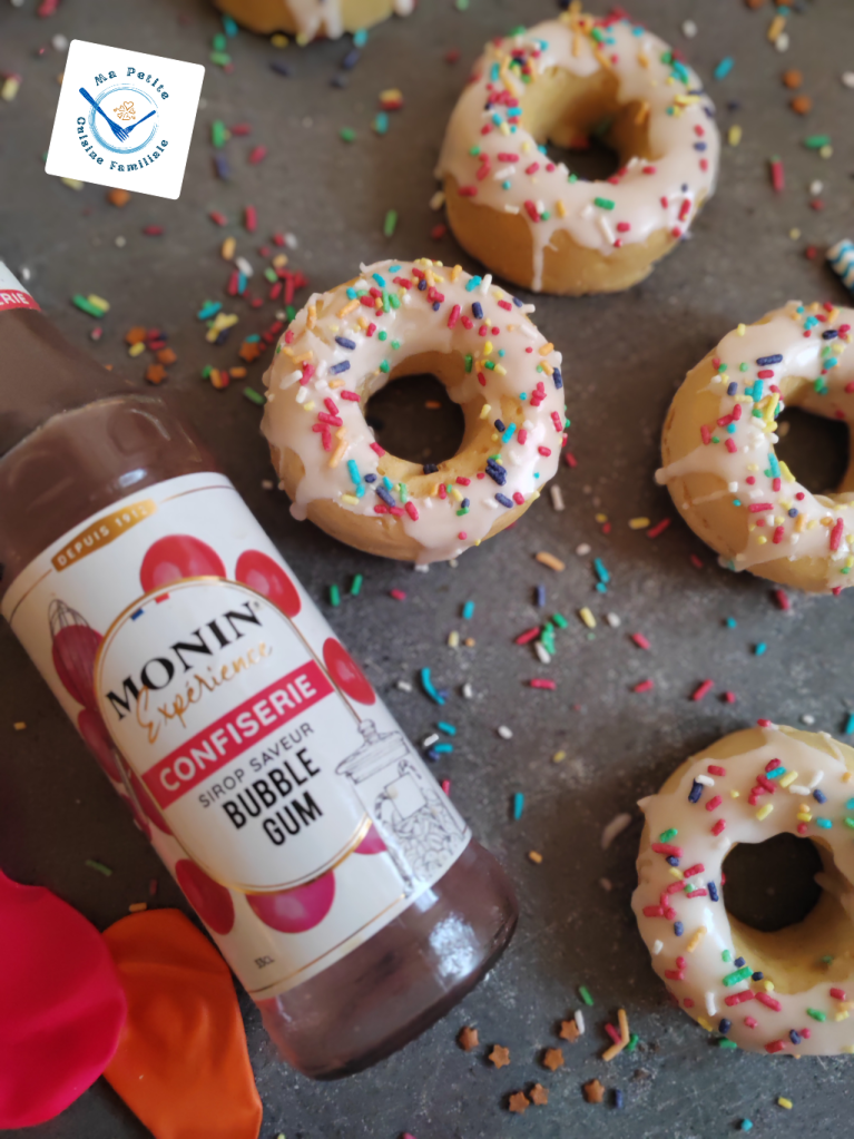 Vous pouvez les décorer d’un glaçage ou non, libre à vous. Pour mes glaçages de Donuts, j’utilise la gamme de sirops « Monin » et du sucre glace. En vrai, les donuts sont glacés avec un glaçage royal composé de sucre glace de blancs d’oeufs. Je cherche la simplicité. Sirop et sucre glace amplement suffisant. Libre à vous d’ajouter du colorant si vous le souhaitez. Je préfère sans, c’est plus naturel.