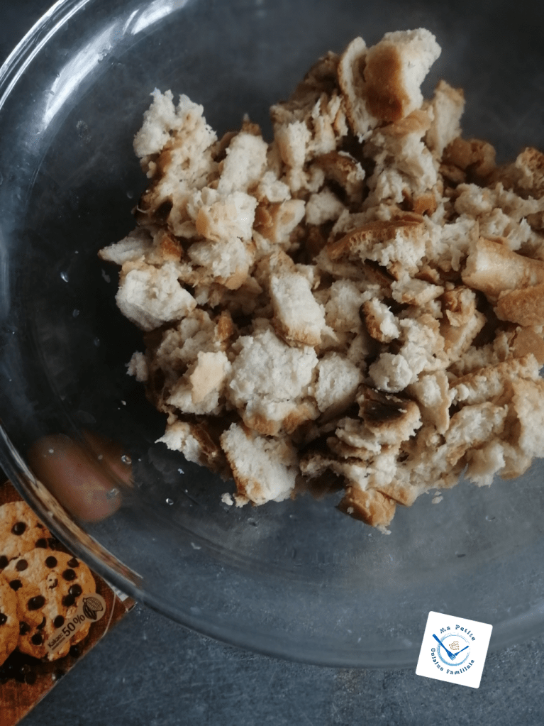 Placez-les dans un grand saladier et versez le litre de lait. Le pain doit complètement absorber le lait, d’où un repas nécessaire d’environ 1h.
