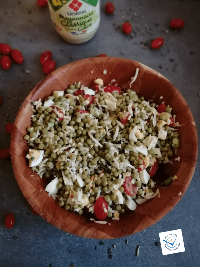 C’est une recette qui ressemble pas mal à la Macédoine finalement et que mes enfants ont apprécié…pas pour les petits pois, mais pour la mayonnaise.
