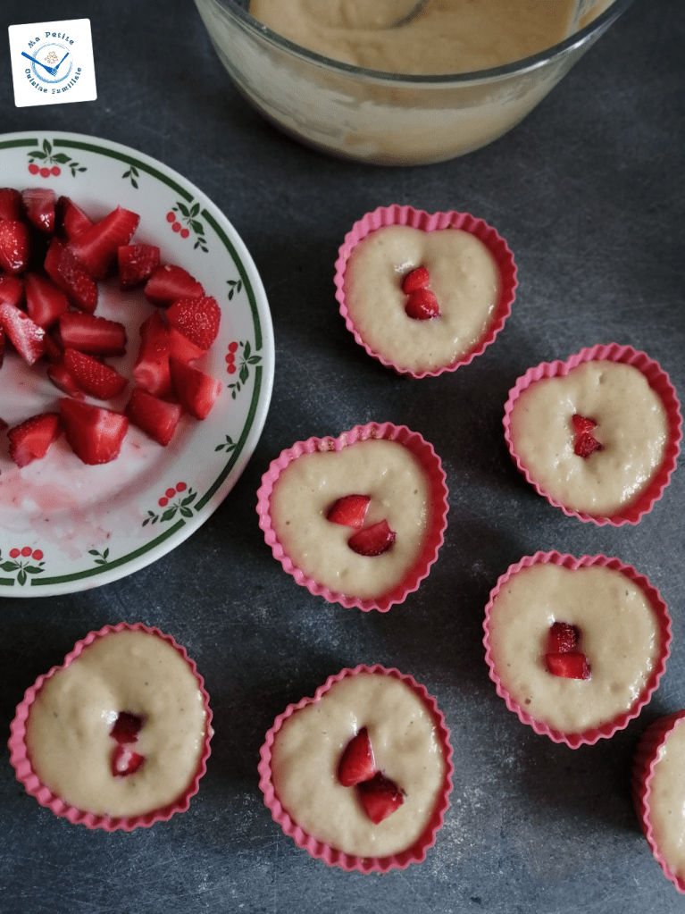 Remplissez les moules à muffins ou les caissettes au 2/3, placez une fraise au milieu. Si elles sont trop grosses coupez-les en 2.