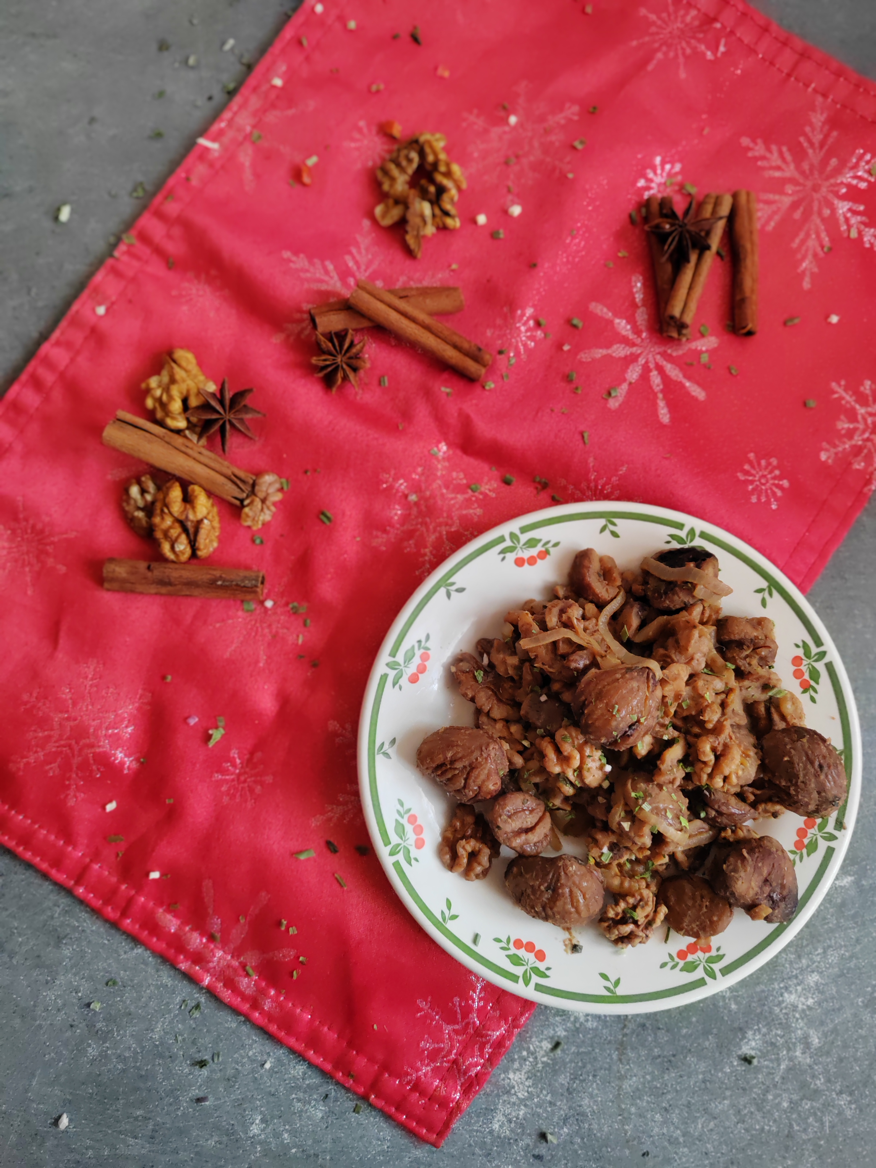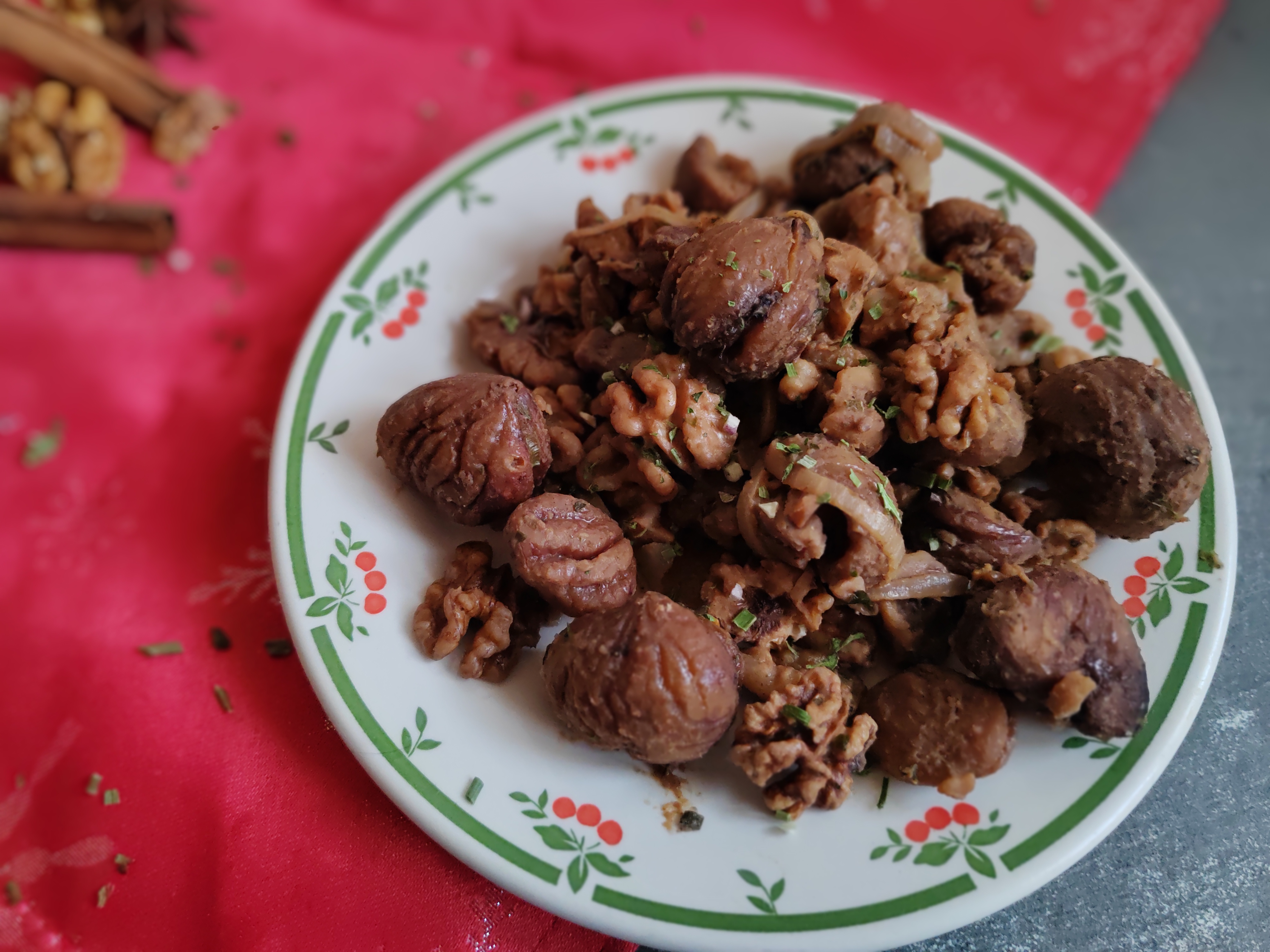 C’est donc un accompagnement que je vous propose. Dans cette poêlée, les châtaignes sont associées aux noix, à un bel oignon et rehaussées d’une touche de cannelle et de miel.