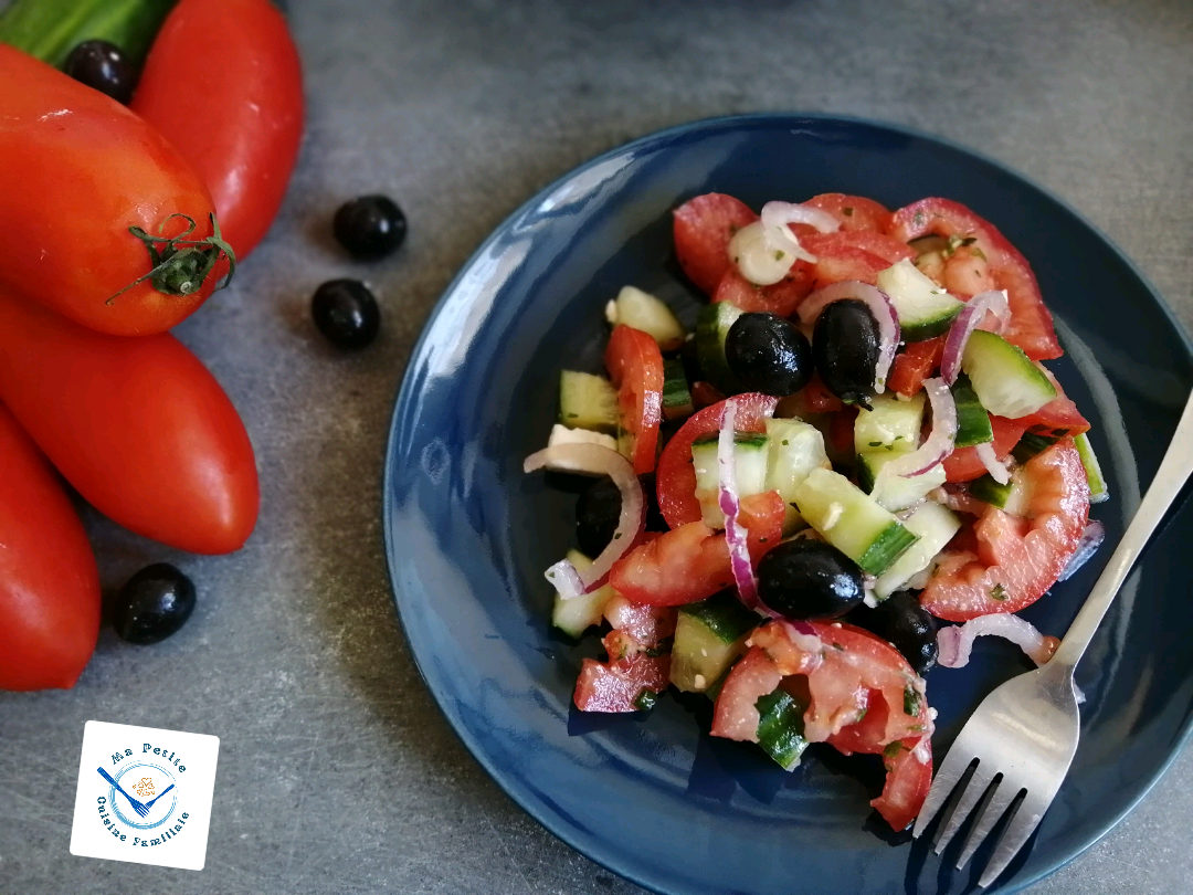 Cette salade fraîche que je vous propose, se compose de tomates allongées odorantes, de concombres craquants, d’oignons rouges forts en bouche, d’olives noires au bon goût de Méditerranée, de fêta pour le côté vacancier. Un beau mélange.