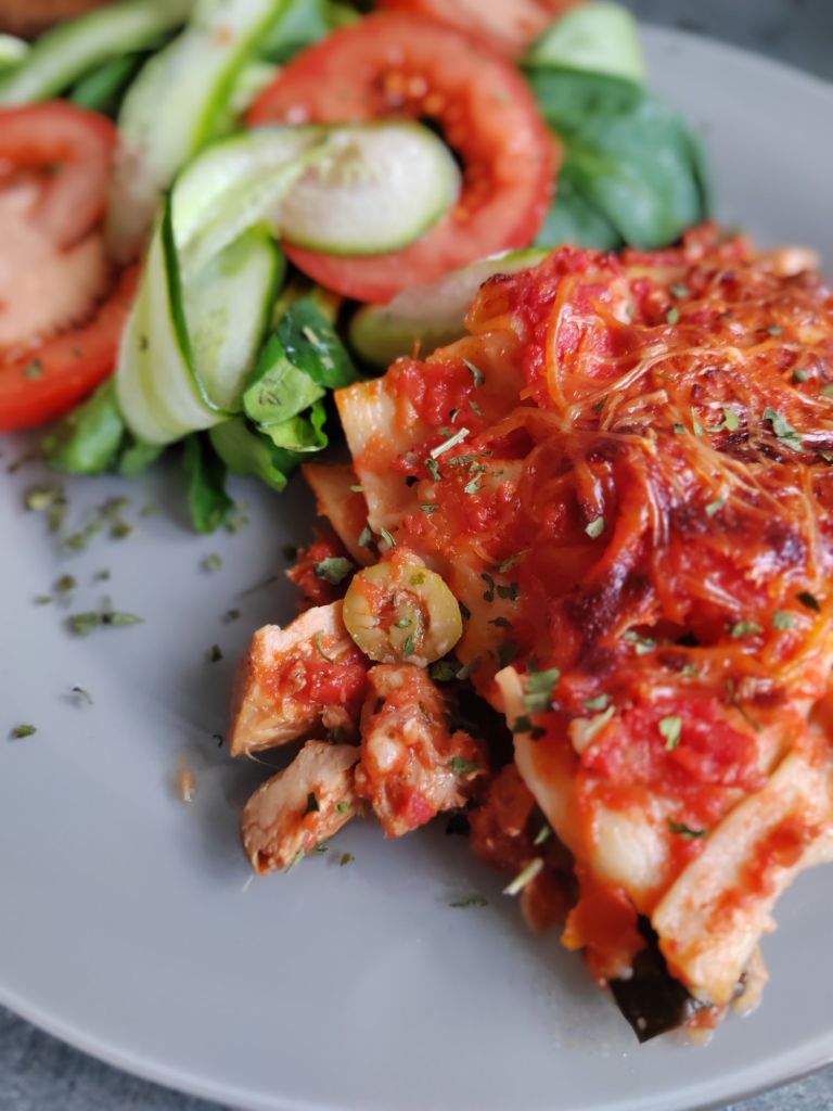 Une autre couche de préparation courgette/thon/olives. Béchamel. Pâtes. Jusqu’en haut du plat.