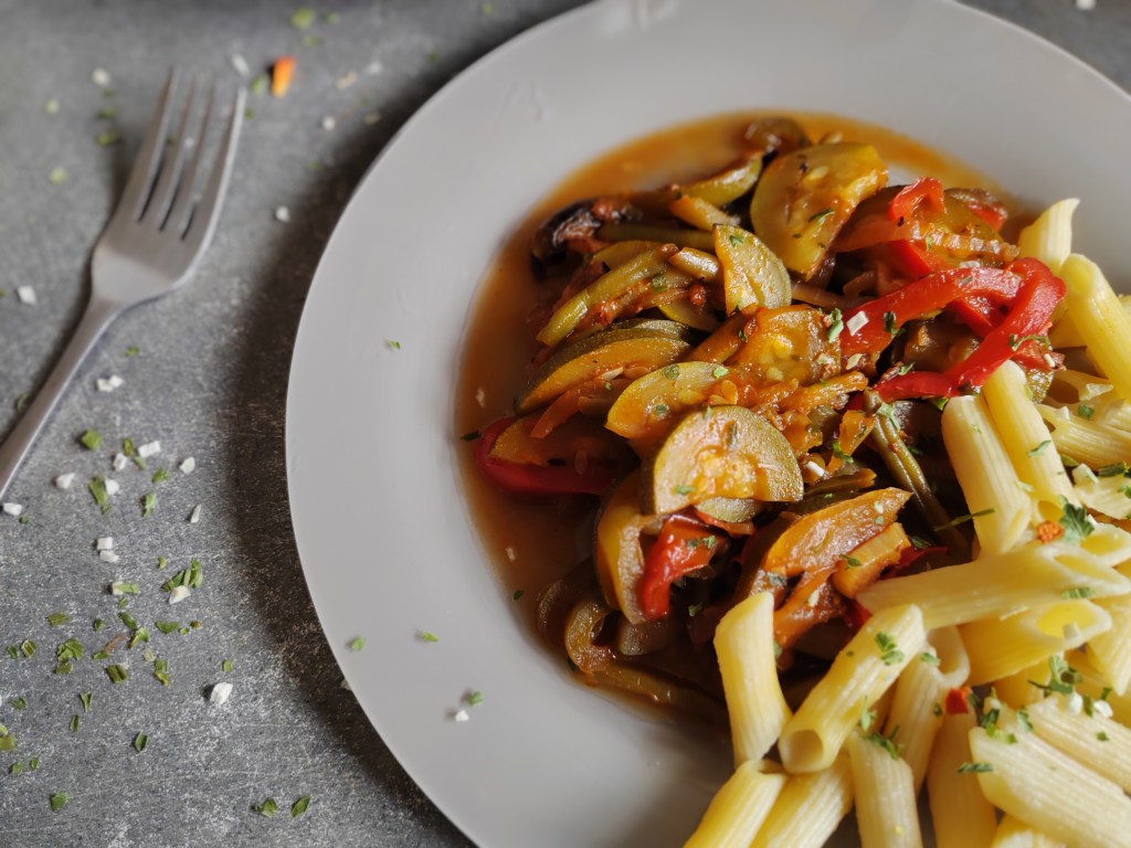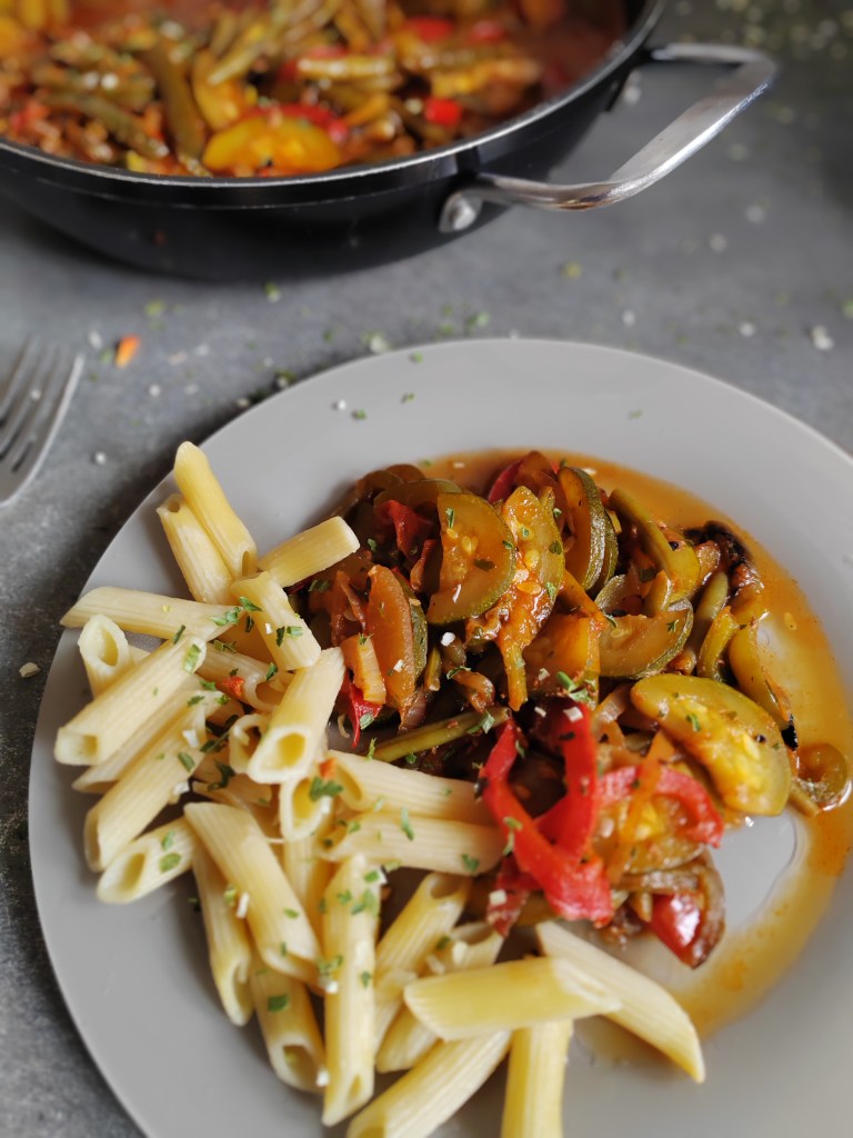 J’ai servi les légumes cuisinés avec des pâtes, à la faveur des enfants, même si ma préférence va au riz.