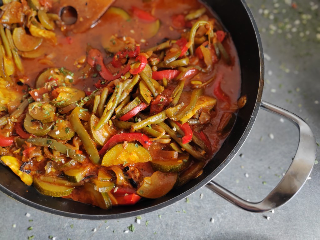 Légumes et herbes aromatiques s’assemblent pour former un plat savoureux, au bon goût d’été et à l’odeur méridionale.