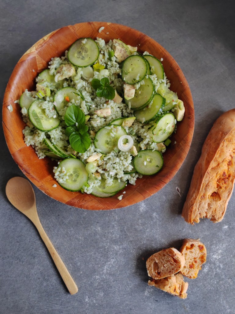 J’ai décidé de l’utiliser pour préparer une salade dans laquelle je rajoute quelques légumes qui sont verts aussi. Je cite le concombre et l’avocat. Le croquant du concombre dénote avec le fondant de l’avocat et du riz. La couleur de l’ensemble est très agréable à regarder.
