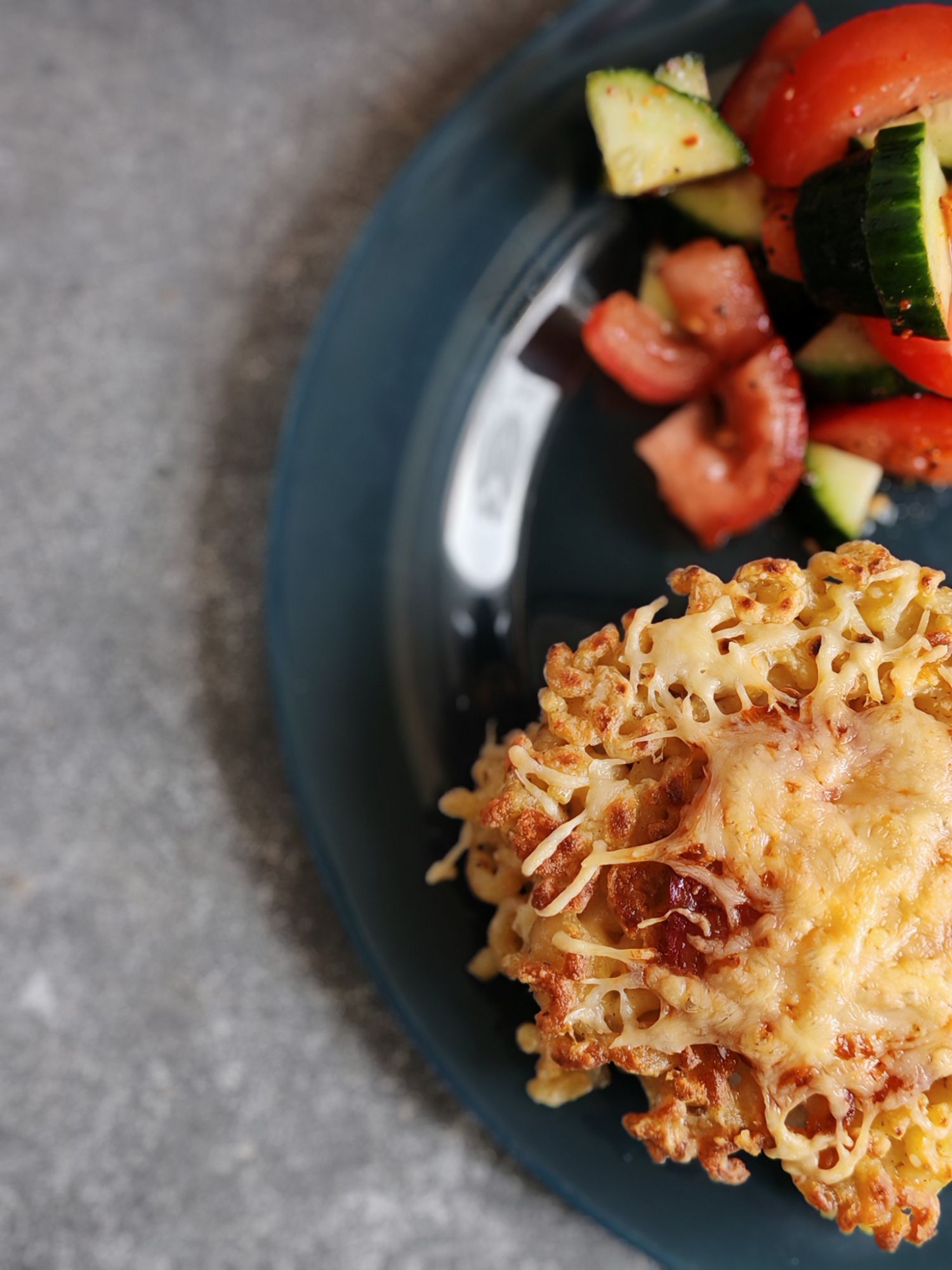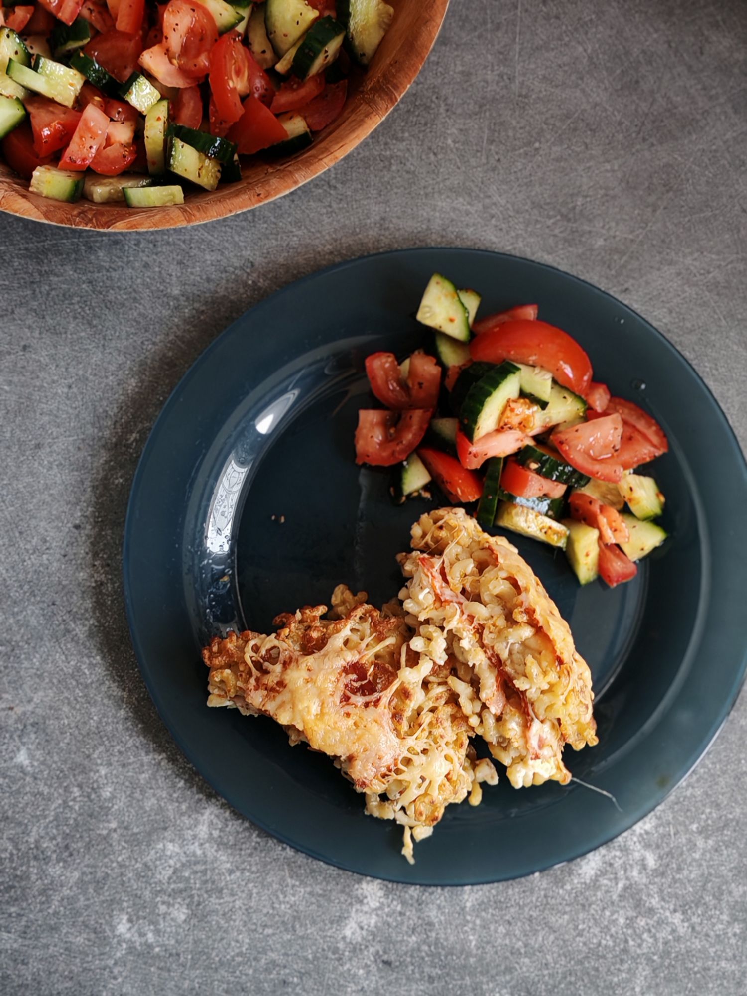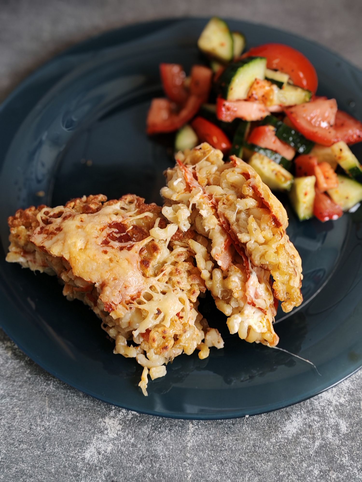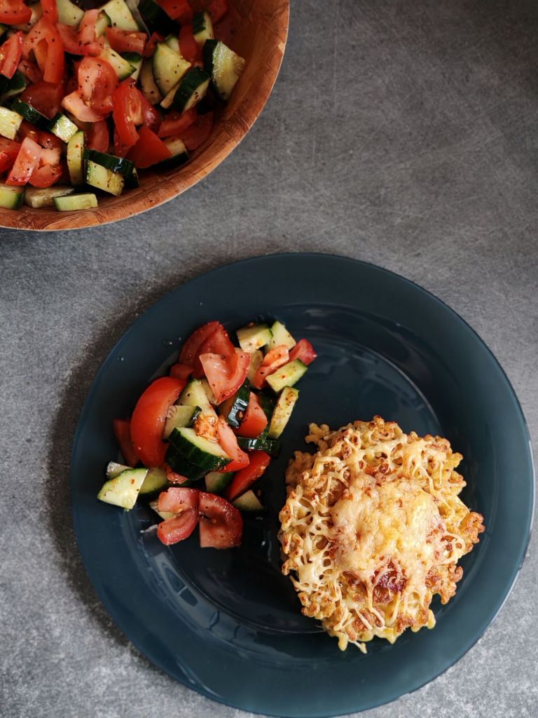 J’ai servi ces croq’coquillettes avec une salade croquante de tomates et concombres.