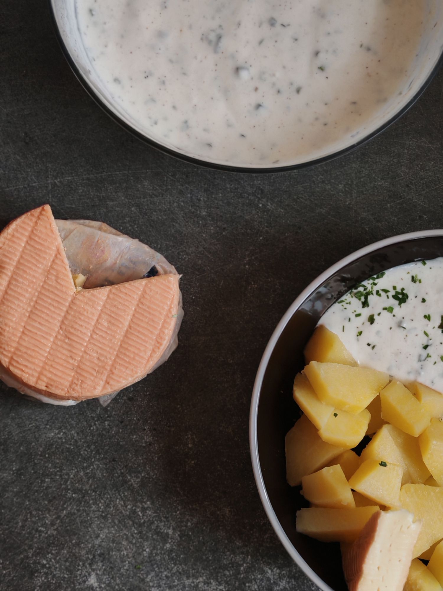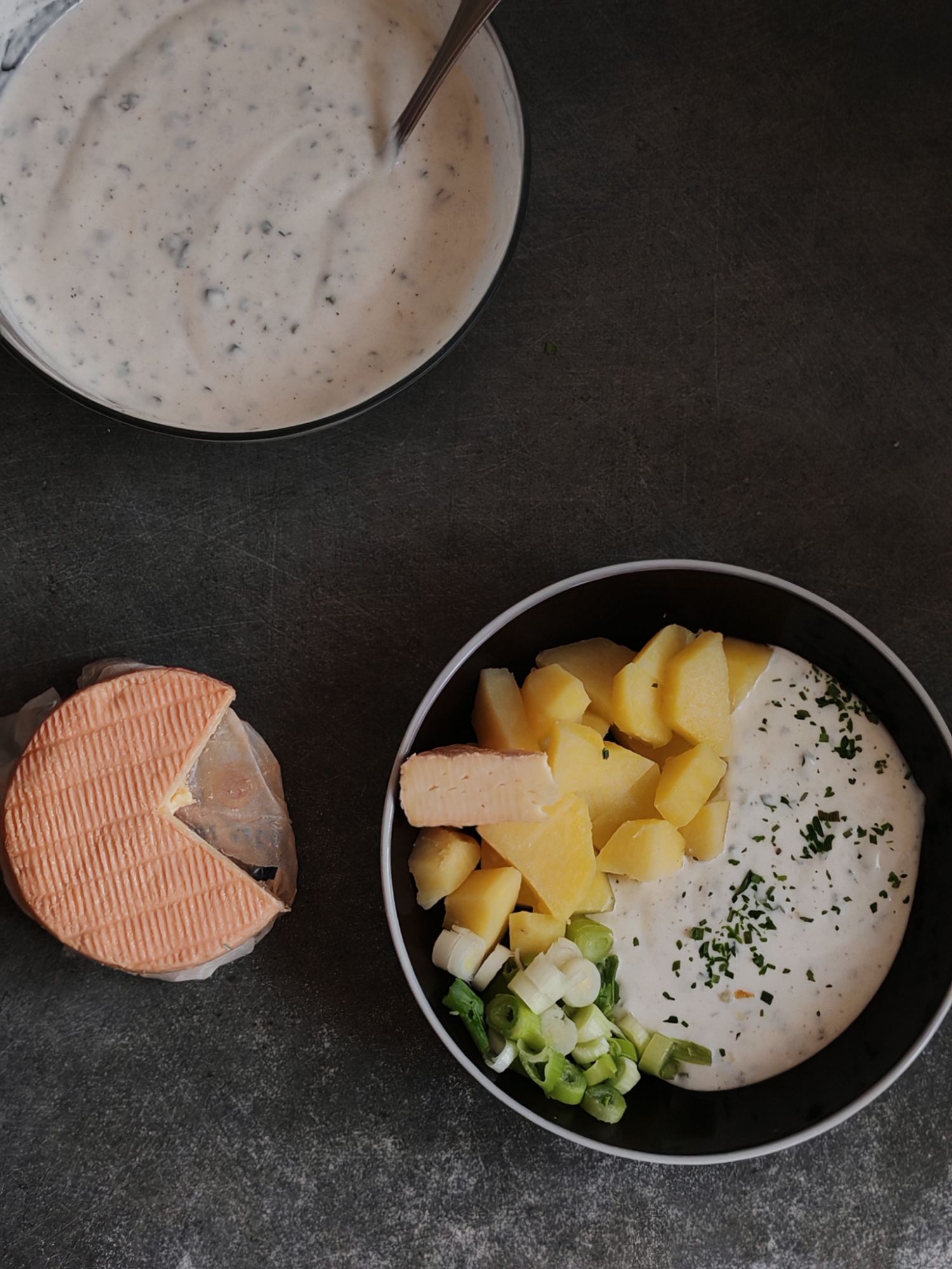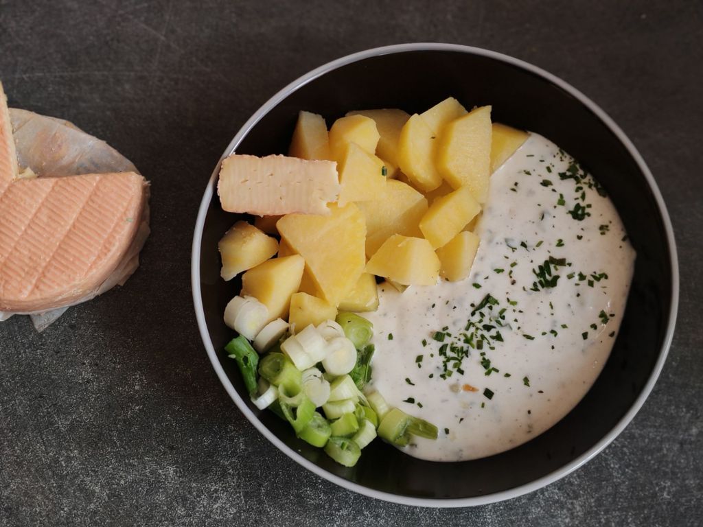 Accrochez vous pour la recette. Il vous faudra des pommes de terre, du fromage blanc nature, de la ciboulette, du persil, des échalotes, du munster, sel, poivre, muscade et des pommes de terre.