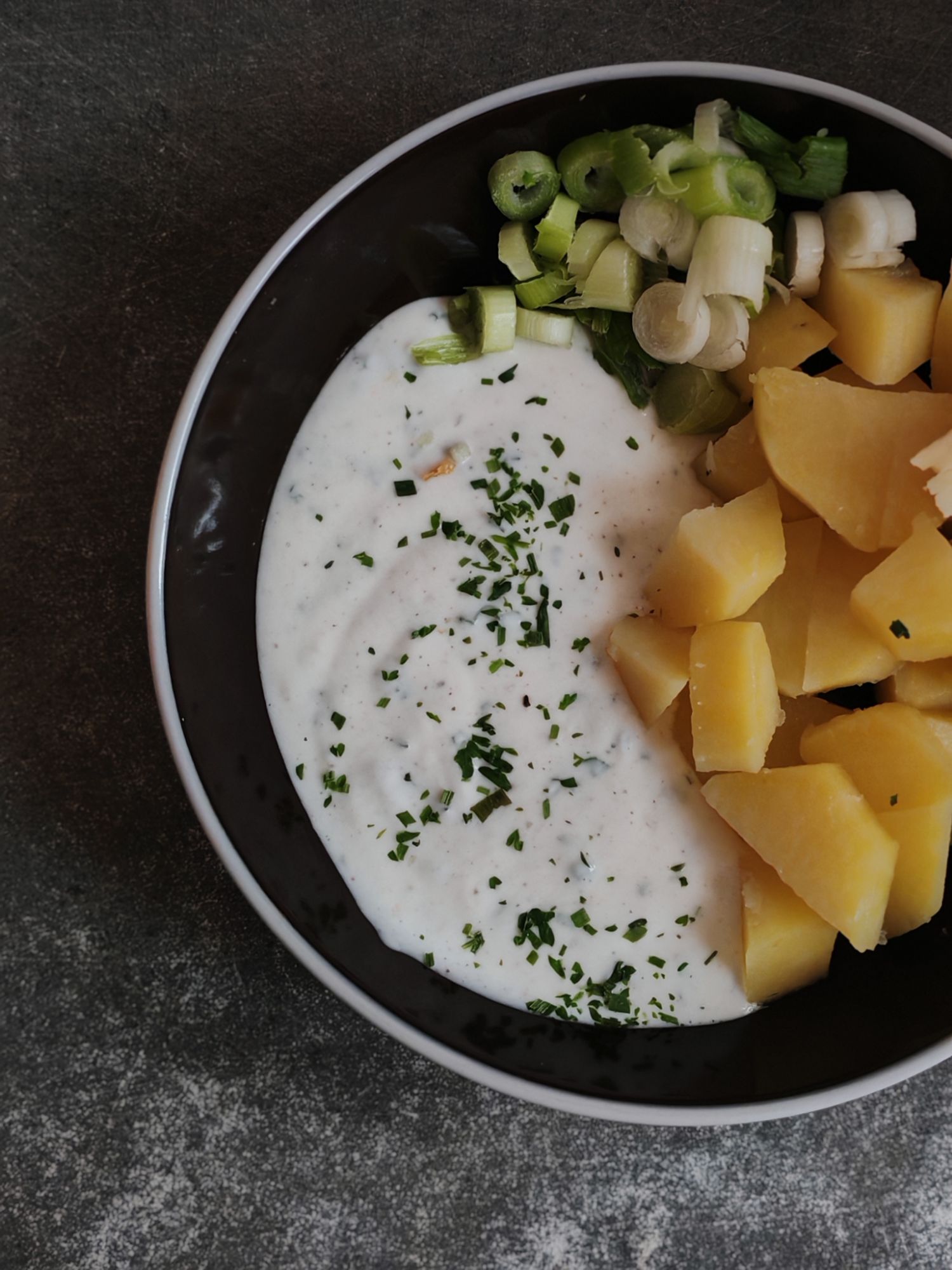 Certains serviront avec de la charcuterie ou des pommes de terre grillées, des oignons crus pour les plus téméraires. Nous non, ce sera pommes de terre cuites à l’eau, et pas de charcuterie, le fromage blanc apportant déjà une bonne dose de protéines.