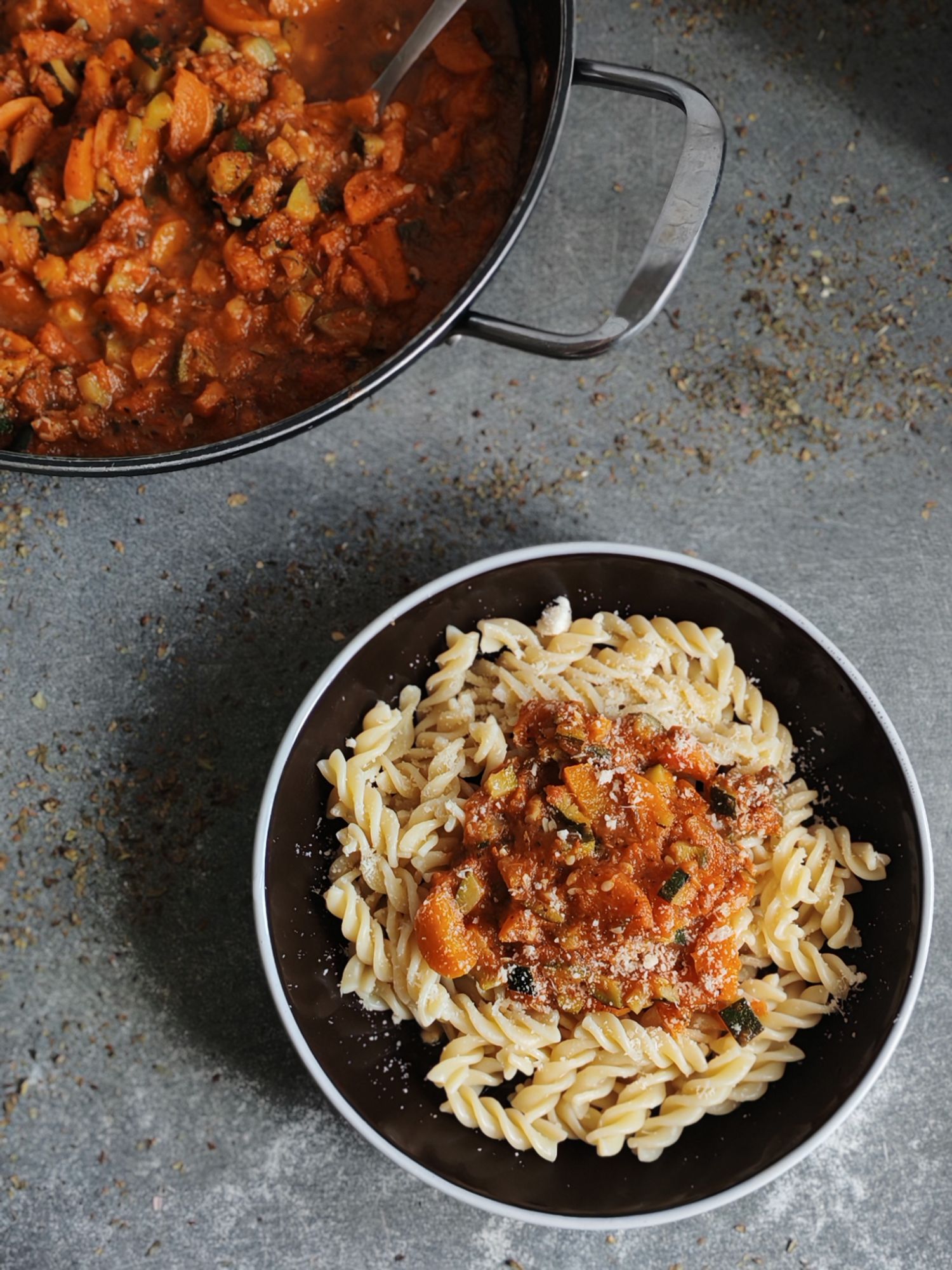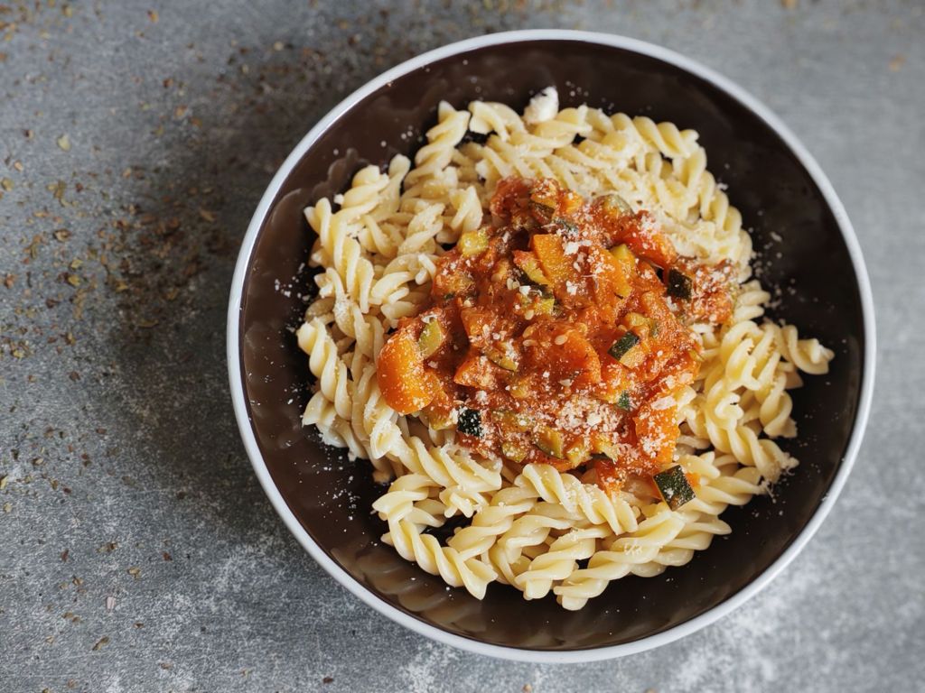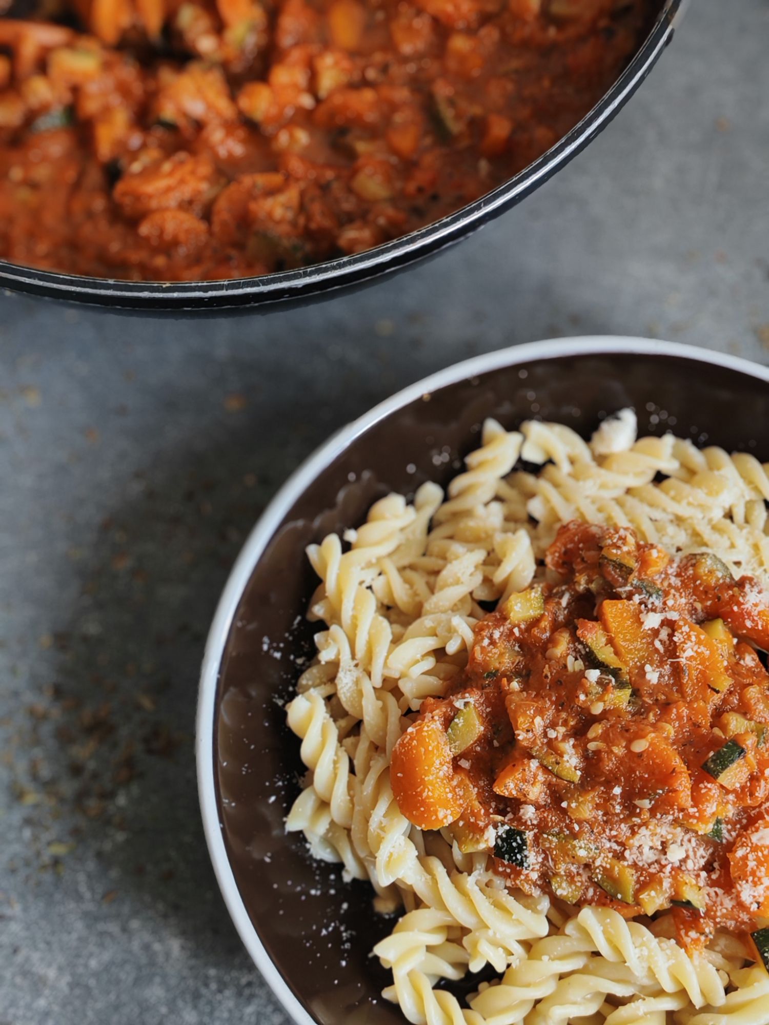 Bien sûr, on sert allégrement cette bolognaise avec des spaghettis ou d’autres pasta et si tu le souhaite, tu peux agrémenter de parmesan ou de gruyère râpé.