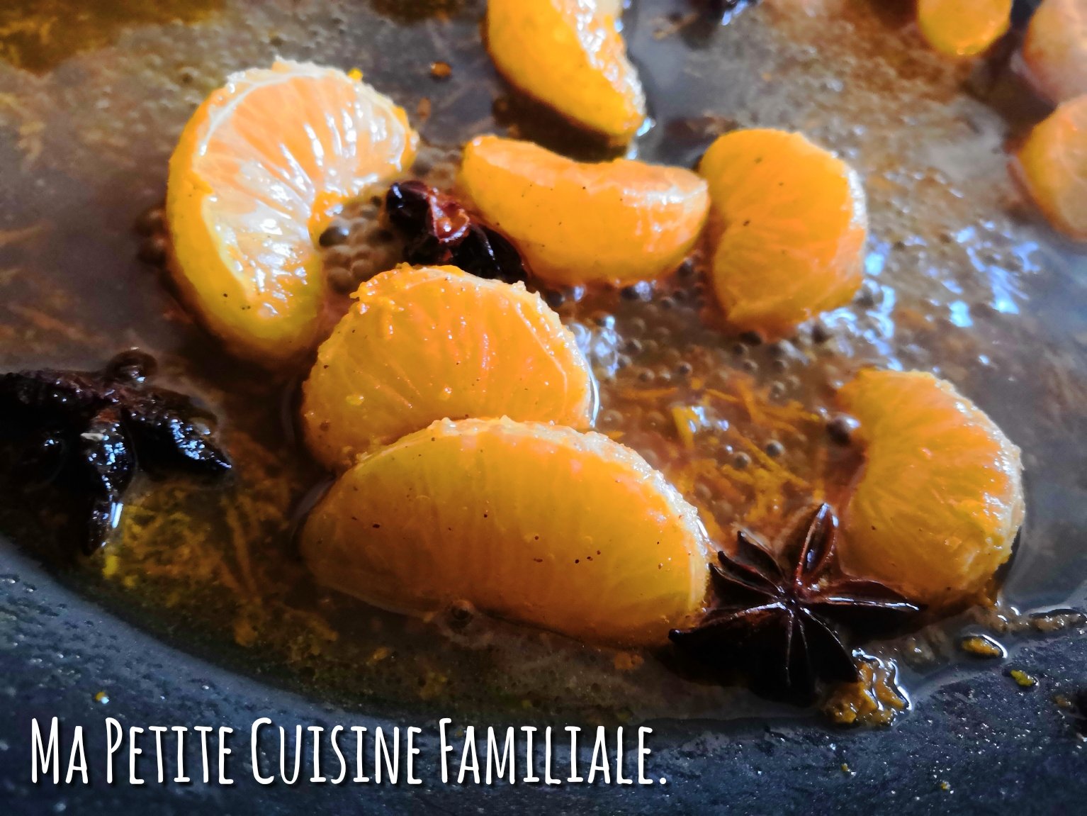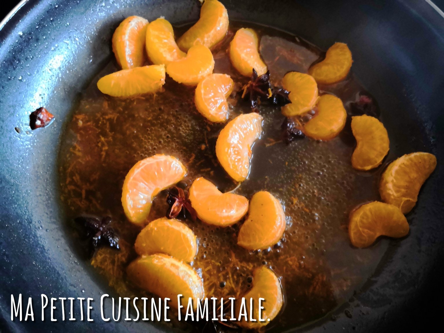 Déglacer avec 1/2 verre d’eau, ajoutez le miel, la cuillère de cannelle, quelques étoiles de badiane et les jus et zestes de clémentines.