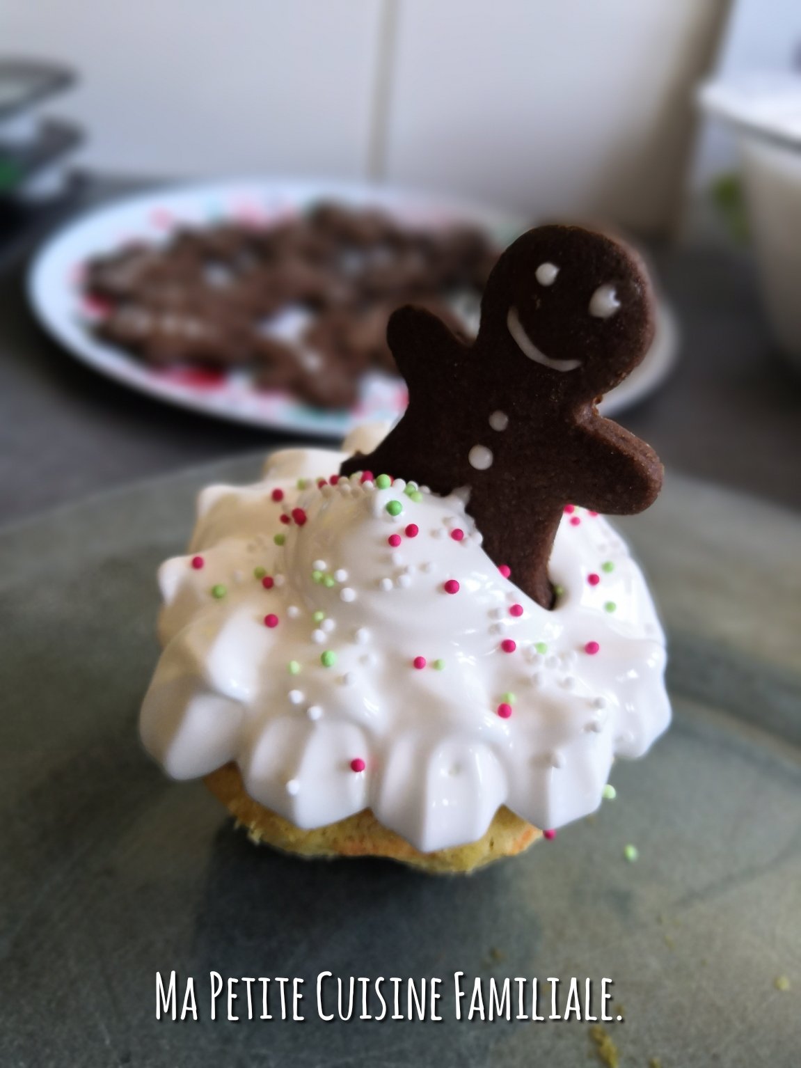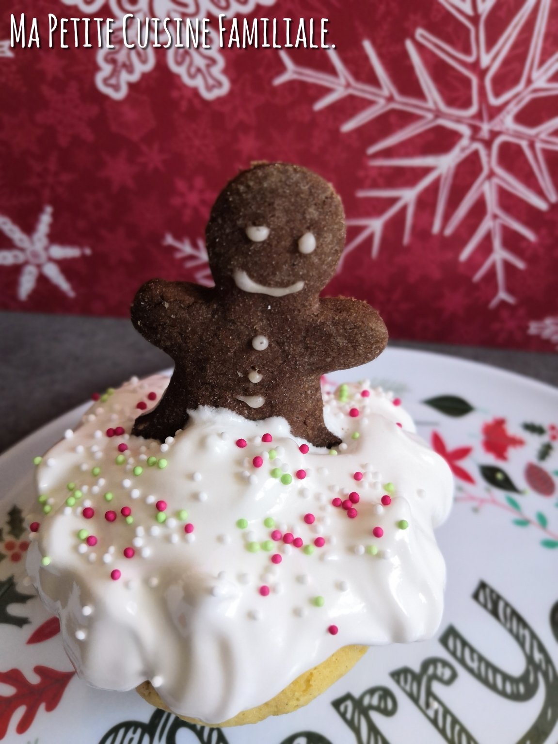 Un glaçage meringué, des perles en sucre aux couleurs de Noël et un sablé bonhomme en chocolat m’ont servi de décor.