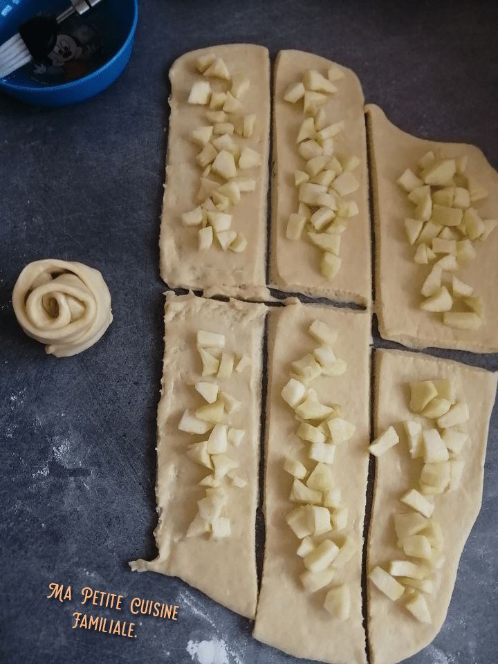 Sur un plan de travail fariné, étalez la pâte en rectangle. Découpez-y des bandes de 4cms de large. Posez des dés de pommes sur les bords en évitant les bords.